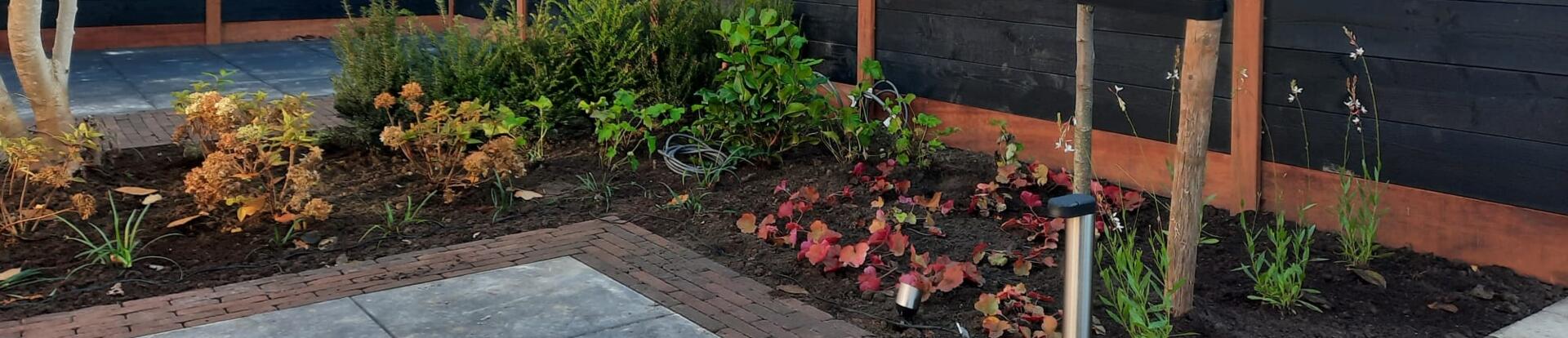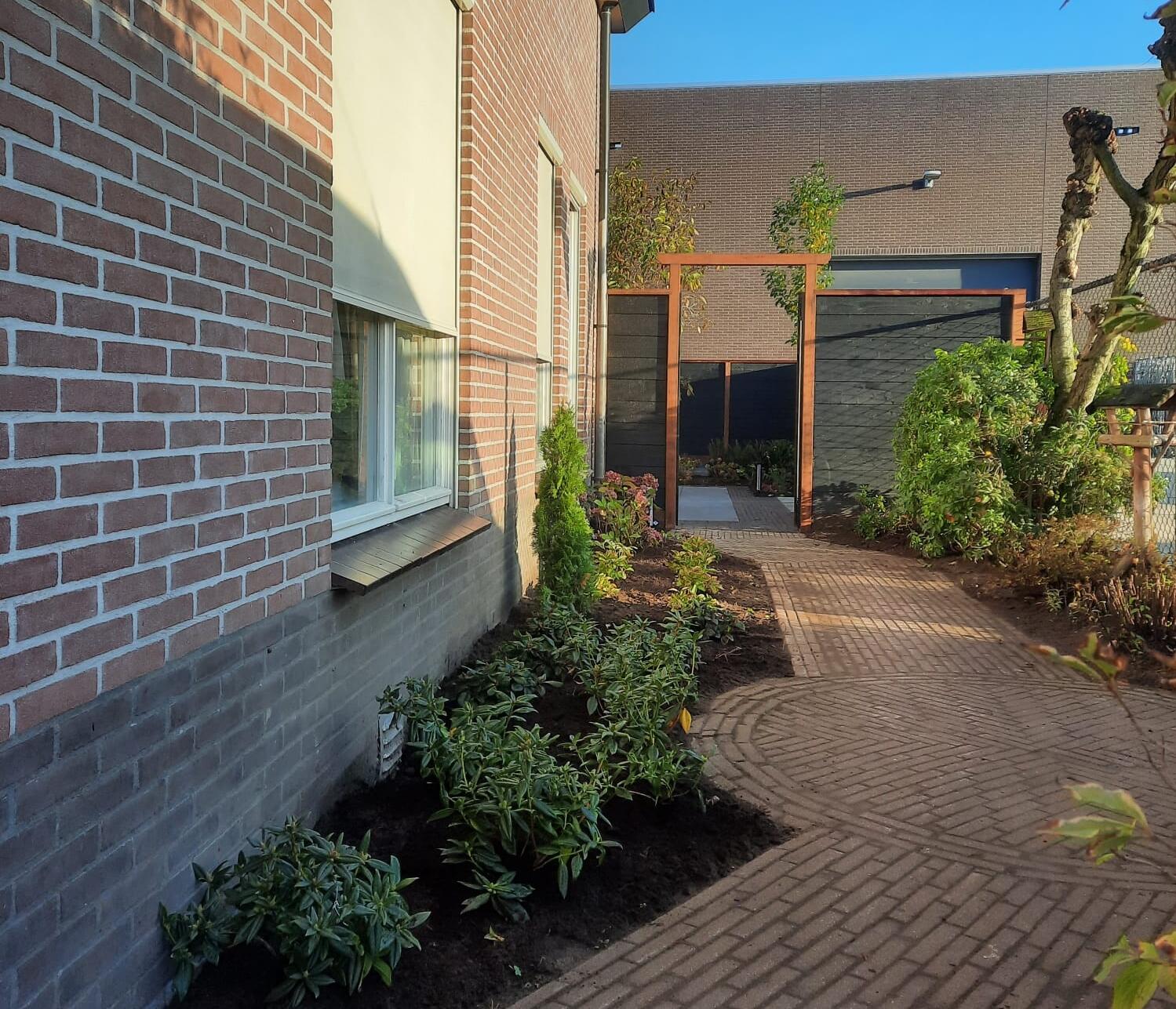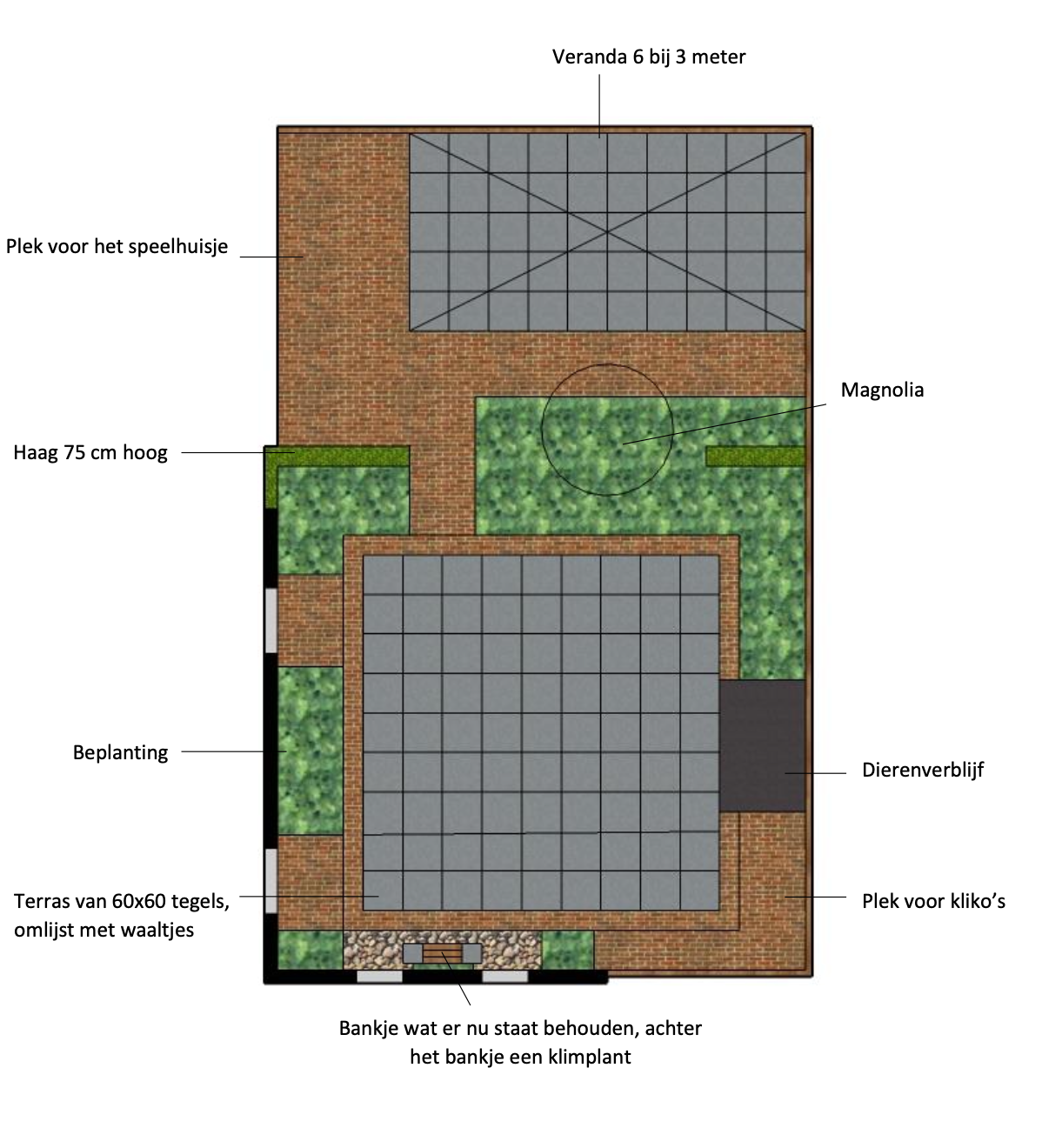 In deze achtertuin in Barneveld lagen de plekken voor het speelhuisje, de veranda, het dierenverblijf en de kliko’s al vast. De wens voor een ruim terras stond ook centraal. Daaromheen hebben we een zo groen mogelijke tuin ontworpen, met beplanting die het hele jaar door leeft en bloeit.