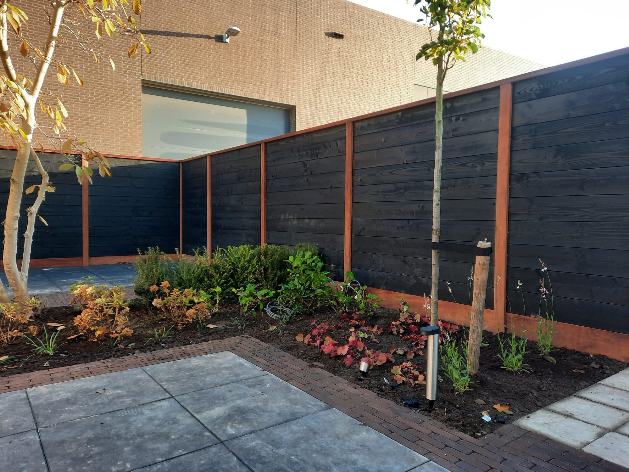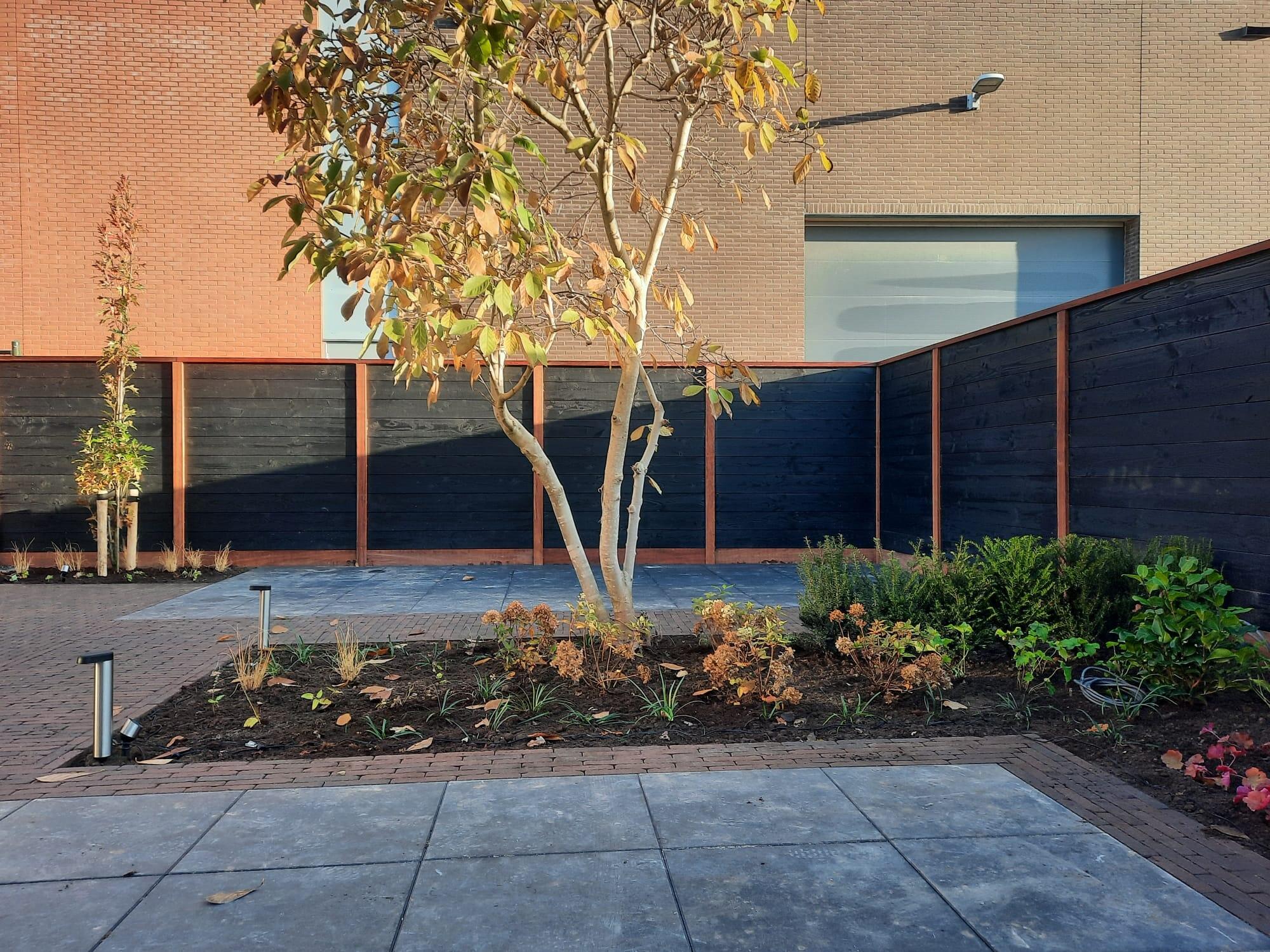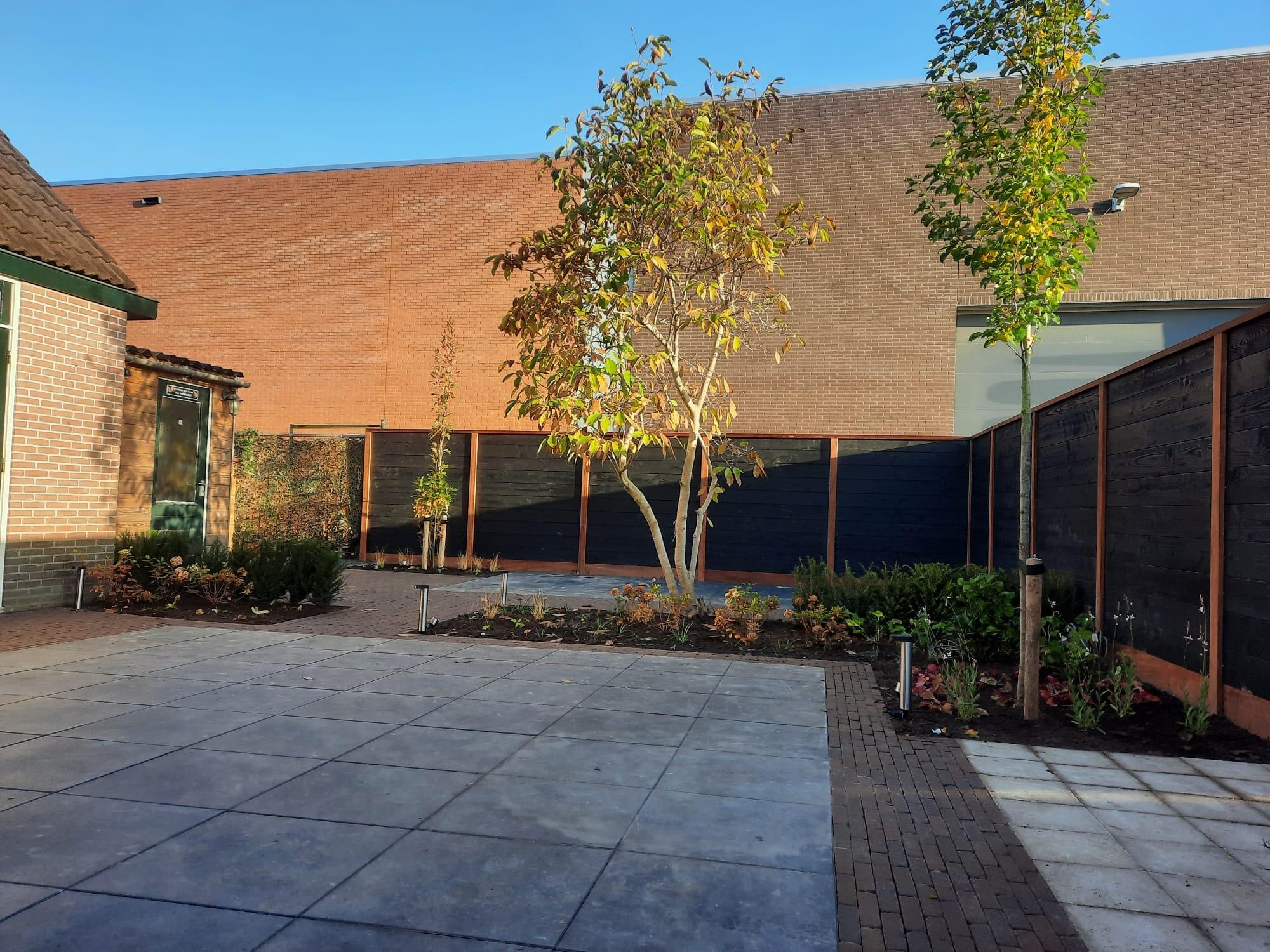 In deze achtertuin in Barneveld lagen de plekken voor het speelhuisje, de veranda, het dierenverblijf en de kliko’s al vast. De wens voor een ruim terras stond ook centraal. Daaromheen hebben we een zo groen mogelijke tuin ontworpen, met beplanting die het hele jaar door leeft en bloeit.