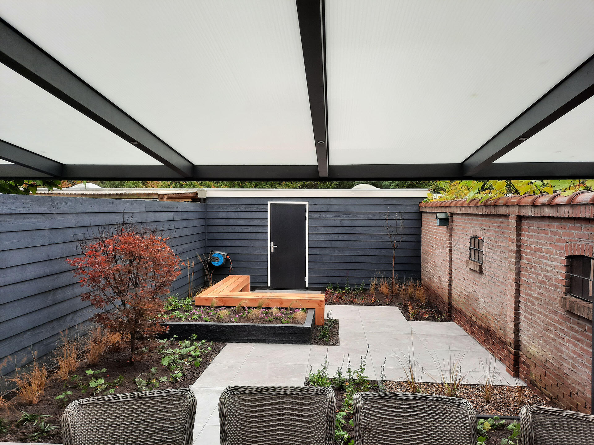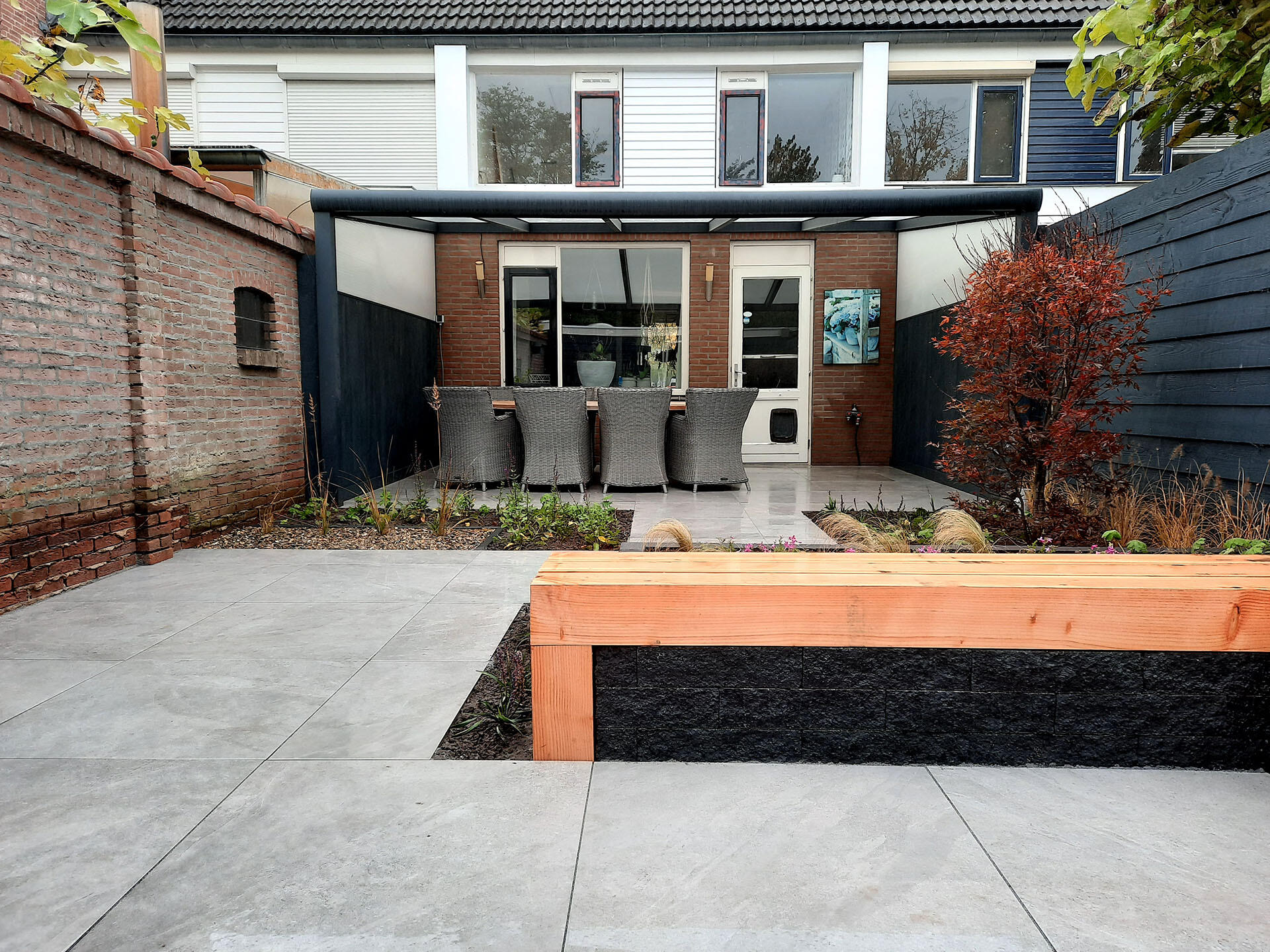 Voor deze achtertuin verzorgden we zowel het ontwerp als de aanleg. Het achterste deel van de tuin werd nauwelijks gebruikt, terwijl het juist een fijne, schaduwrijke plek is. We hebben daar een zitbank ingetekend, zodat de hele tuin nu uitnodigt tot gebruik.