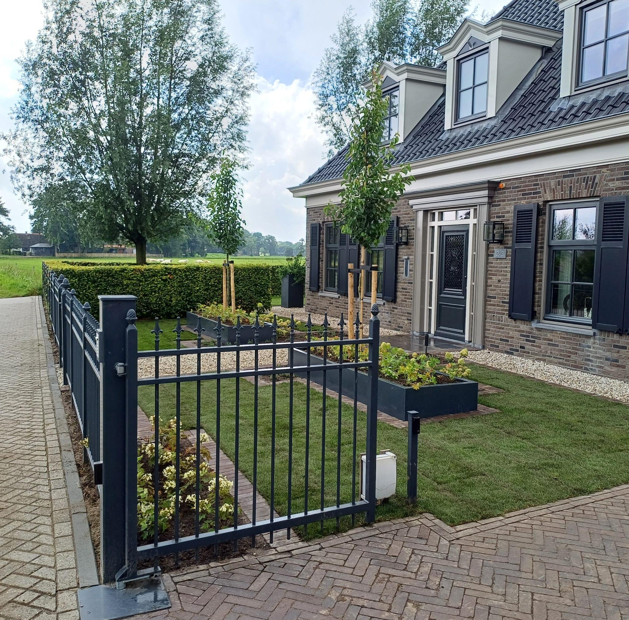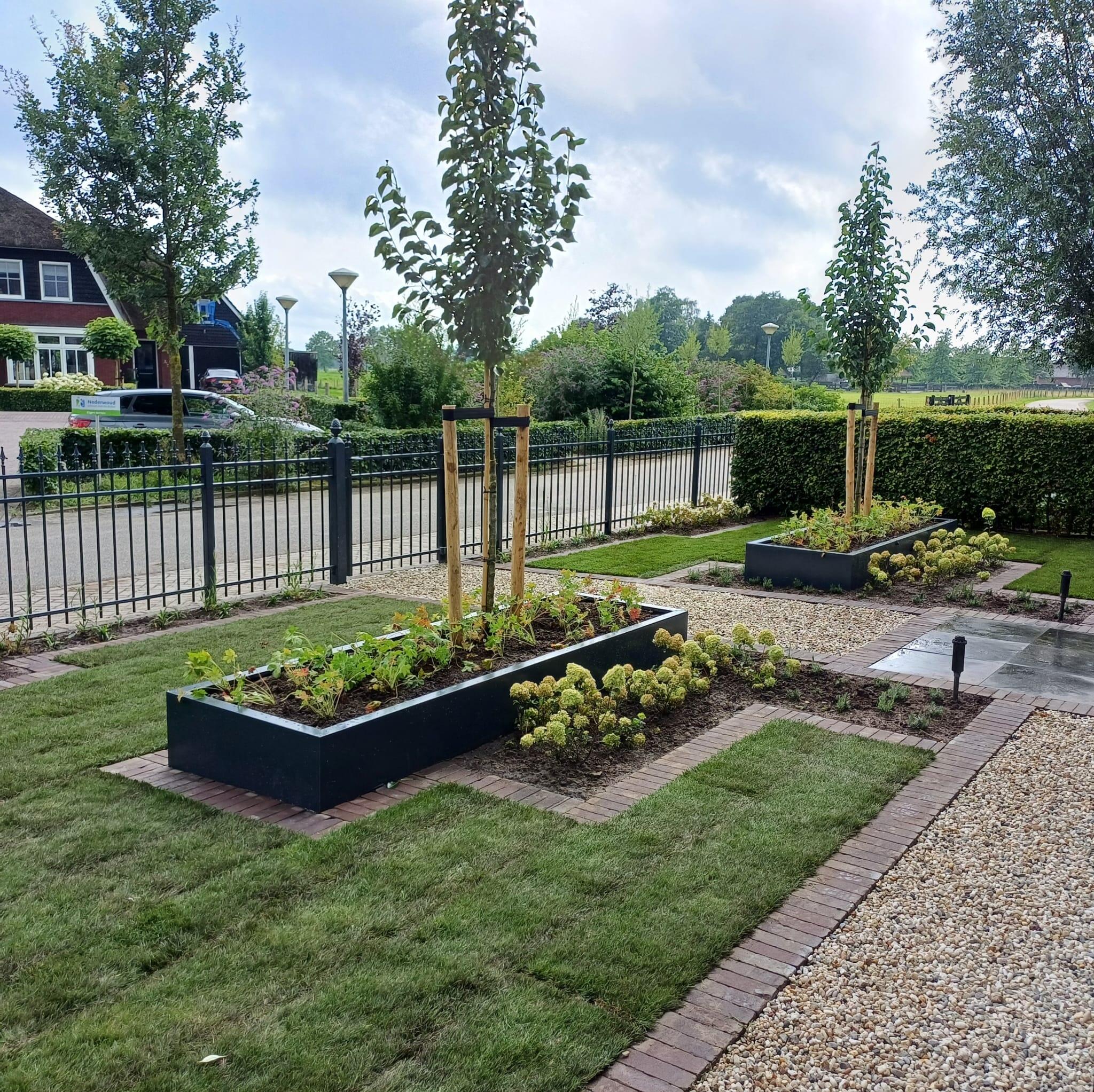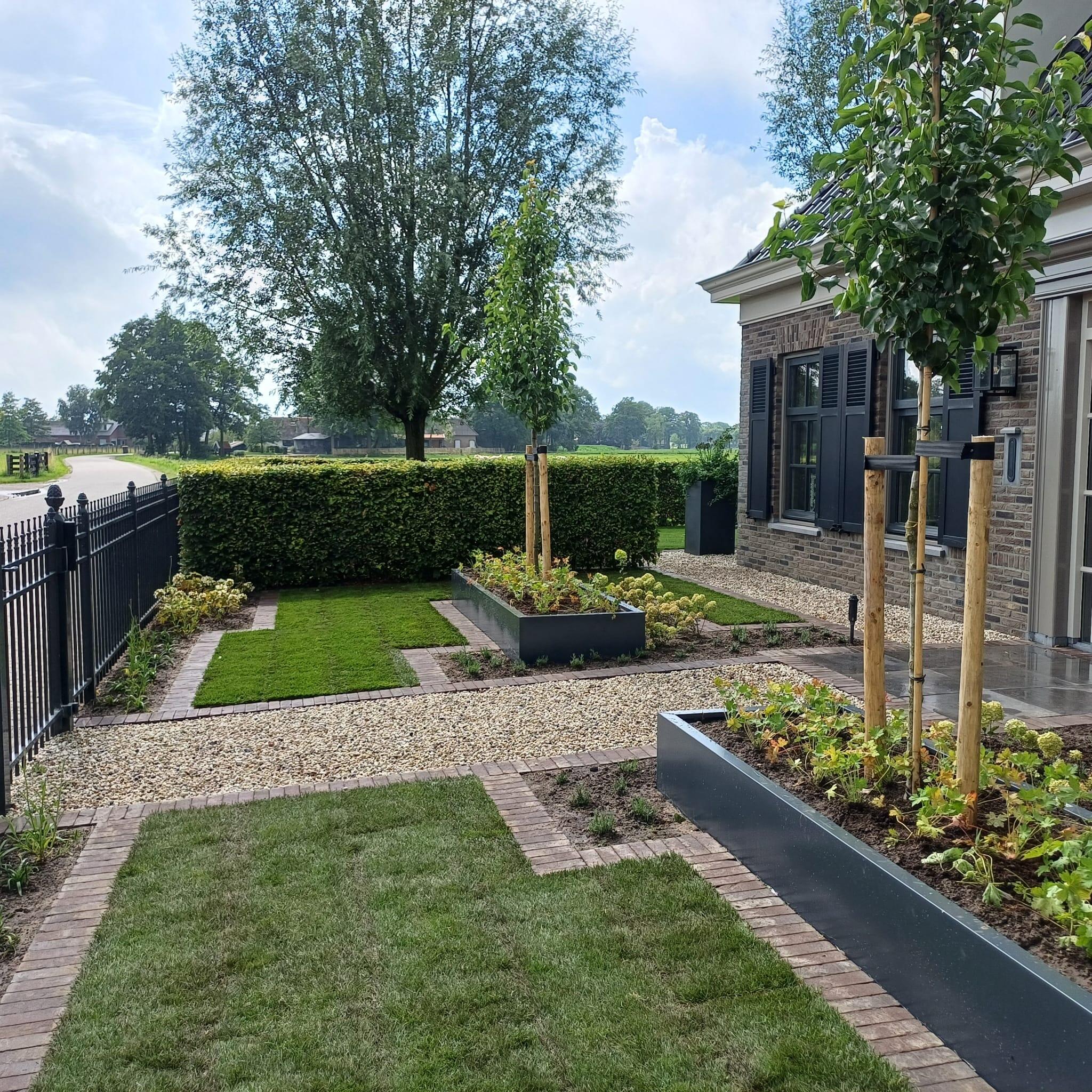 Voor deze voortuin in Lunteren verzorgden we het ontwerp en de aanleg. De oude buxushagen waren afgestorven, dus is gekozen voor een nieuw gazon, een pad naar de voordeur met het bestaande grind, en bloembakken voor extra structuur. De beplanting bestaat uit hortensia’s, lavendel en andere soorten in paarse tinten, voor een fris en bloemrijk geheel.